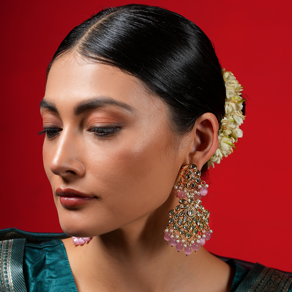A bloom sculpted in gold and light, Gulbahar captures the poetry of spring in every curve.Handcrafted with delicate Kundan, soft pink stones, and luminous pearls, this piece embodies the charm of heritage revived with a modern soul.Finished in 24kt gold plated, it celebrates the union of craft, colour, and timeless grace of an heirloom born to blossom.