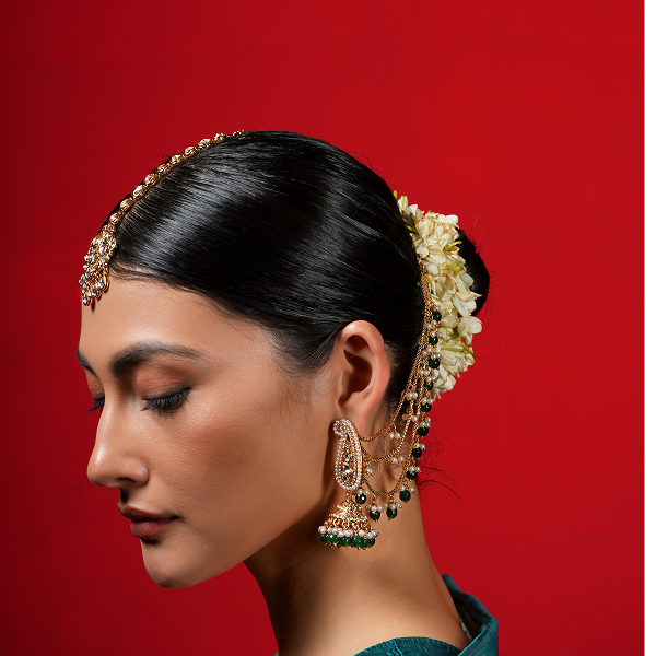 Introducing Kaan Leher Chain, a graceful ear accessory inspired by the gentle rhythm of waves. Handcrafted with delicate artistry, this kaan chain features three cascading layers of fine gold toned links, each adorned with 24kt gold-plated detailing, freshwater pearls, and soft green gemstone droplets that sway beautifully with every movement