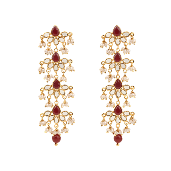Whispers of royalty meet the charm of folklore in Laal Pari. Handcrafted in 24kt gold plated, these earrings blend ruby-red stones, uncut Kundan, and delicate pearls in a cascading design that moves like poetry.