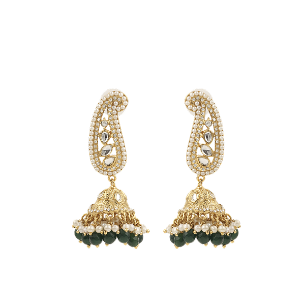 Paisley Noor celebrates the elegance of timeless design, a union of heritage and light. Handcrafted in 24kt gold plated, this earring features a paisley silhouette adorned with Kundan stones, fine pearls, and intricate filigree detailing. Every curve tells a story of Mughal grace and craftsmanship, creating an heirloom piece that glows with quiet majesty and enduring beauty.