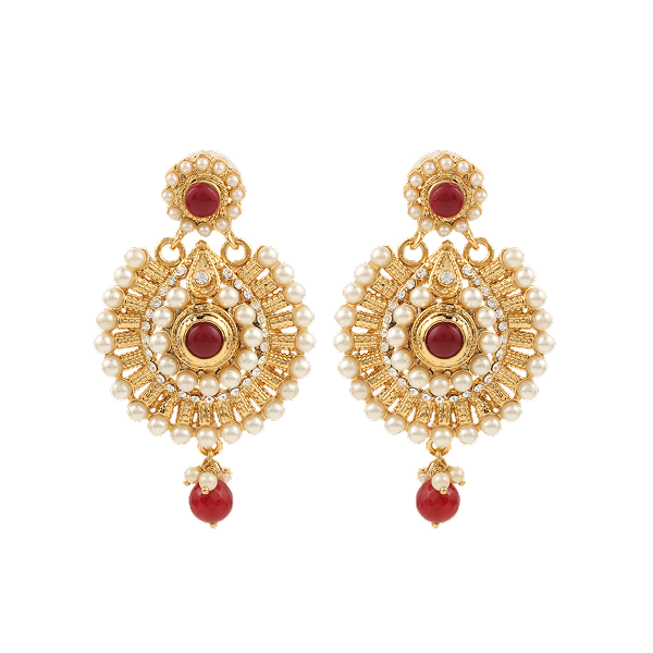 Rani Rooh captures the essence of royal spirit: elegant, luminous, and eternal. Handcrafted in 24kt gold plated, the earring features a circular design adorned with lustrous pearls and ruby stones that mirror the heart of a queen.Each curve and detail is a tribute to regal craftsmanship, a piece that celebrates heritage while whispering stories of strength and grace.