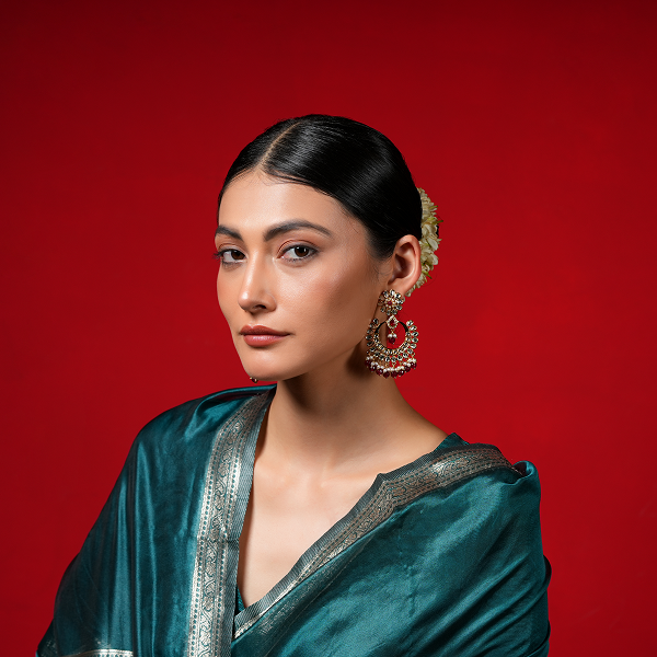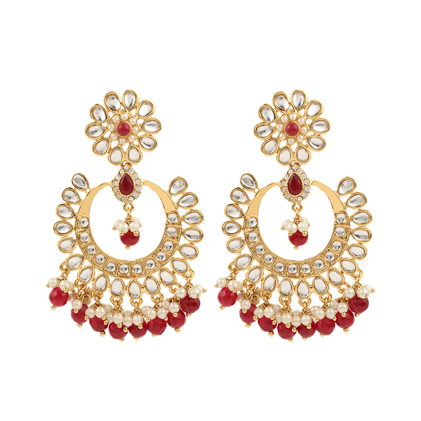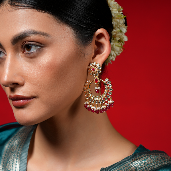 Ruh-e-Gul embodies the soul of a flower radiant, graceful, and eternal. Handcrafted in 24kt gold plated, these earrings feature uncut Kundan stones, ruby-toned beads, and delicate pearls that dance with every movement.Their floral design reflects royal Mughal artistry, reimagined for the modern muse who celebrates tradition with timeless allure.