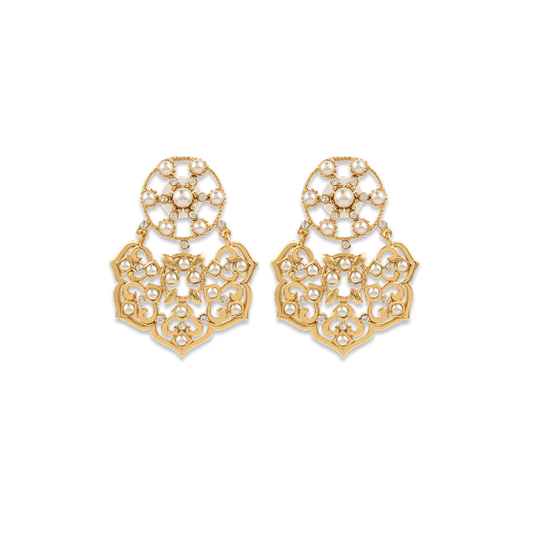 Handcrafted in 24kt gold plated, this statement earring is adorned with luminous pearls and Kundan motifs that echo ancient palace artistry. Every curve and stone is placed with purpose, creating a piece that feels regal, radiant, and timeless — an heirloom crafted for the modern queen.